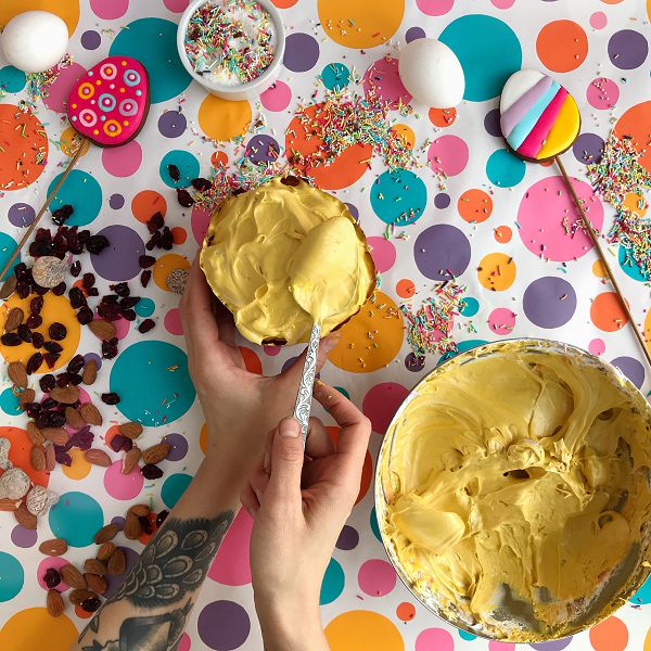 Белок и сахар обьеденим в миске и поместим на водяную баню. Взбиваем смесь миксером на средней скорости, нагревая до 60 градусов. Снимем емкость с бани и продолжим взбивать до устойчивых пик. Окрасим меренгу в любимый цвет и украсим шапочки куличей. Несколько дополнительных штрихов: безе, посыпушки или нарядные пряники на палочках,— и ваш идеальный кулич готов.