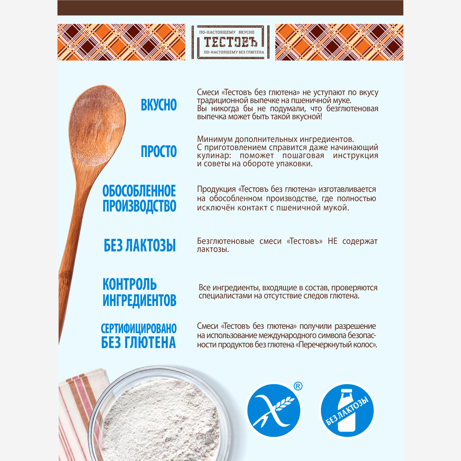• Смесь включает основу из рисовой, кукурузной или другой безглютеновой муки с добавками для правильной текстуры.